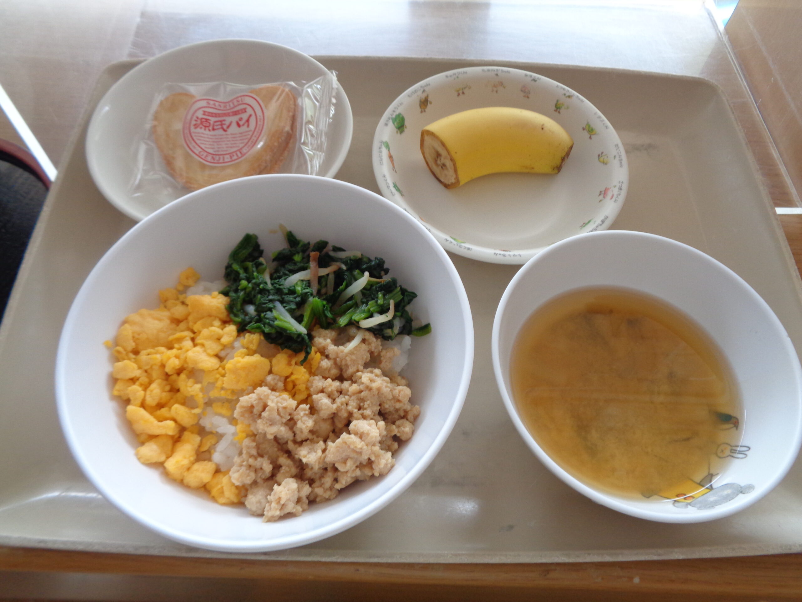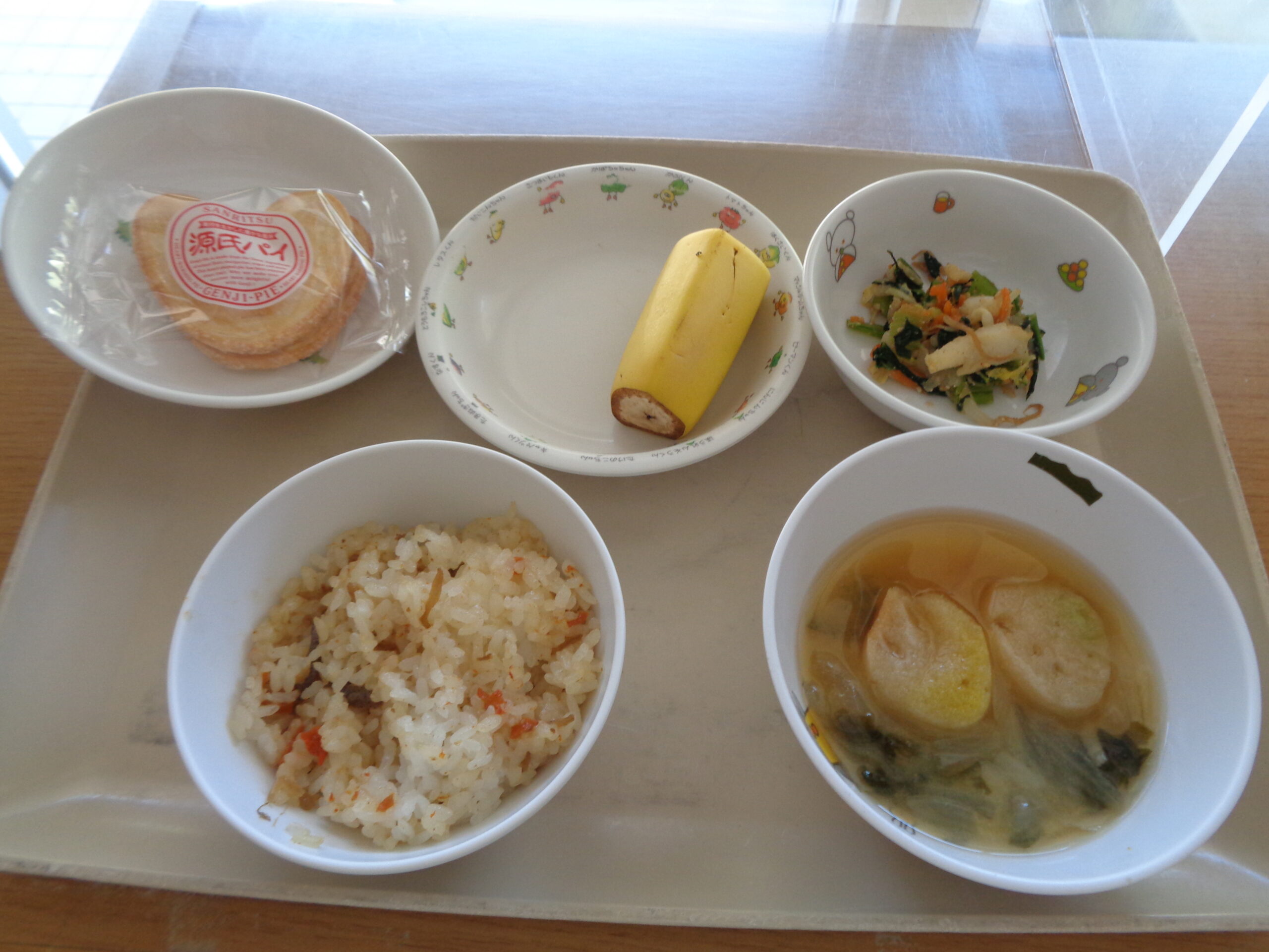 五目御飯 野菜の胡麻和え 麩の味噌汁 バナナ