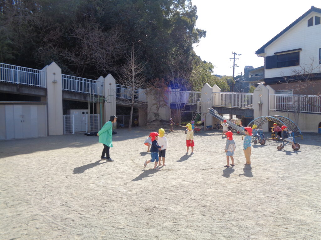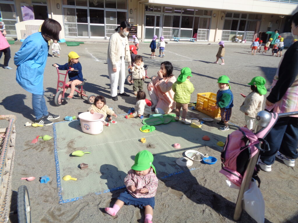 2人の可愛い赤ちゃんが参加してくれました。春のような暖かい日だったので園庭に出て、園児たちと遊びました。