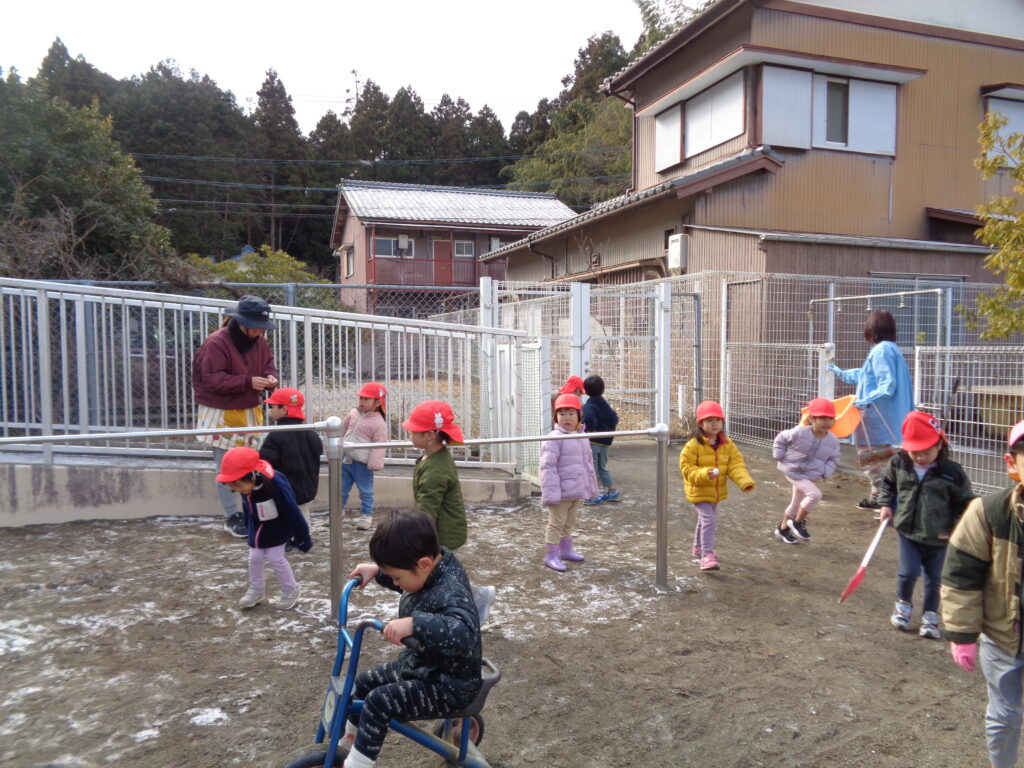 月曜日の朝、園庭にうっすら雪が積もりました。今年度初めての雪です。わずかな雪でしたが、
