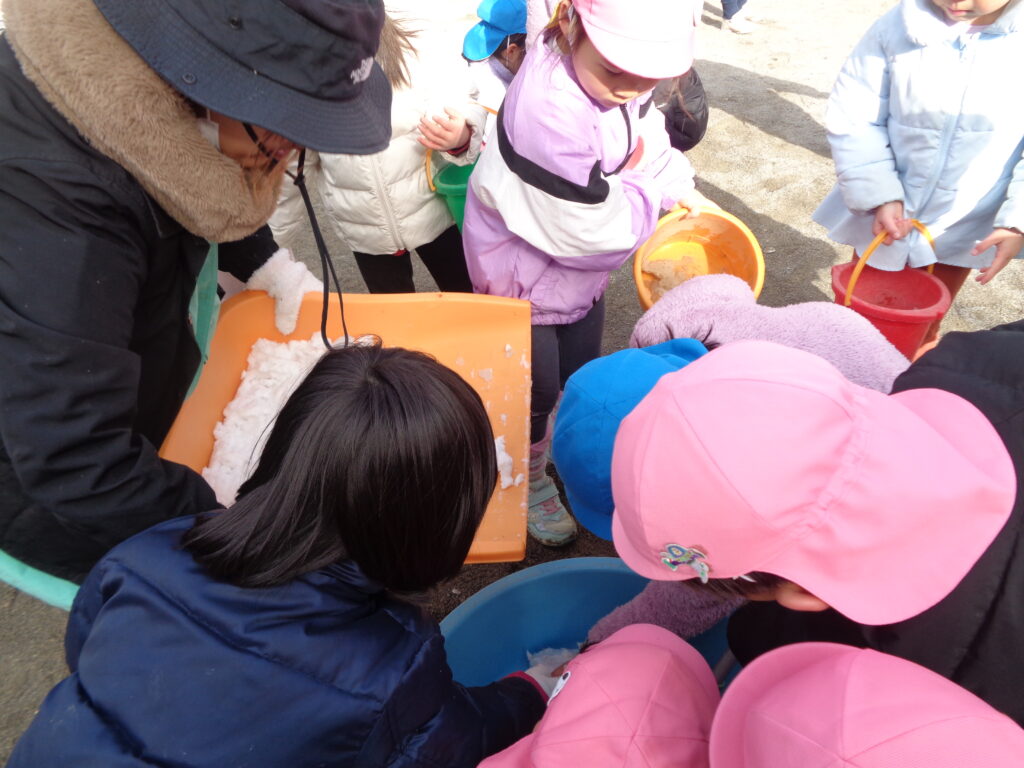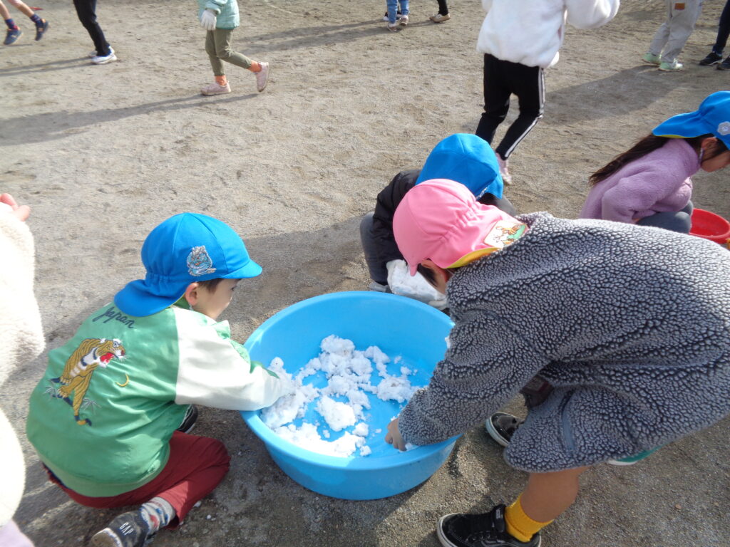 子どもたちは大喜びで、すぐに園庭に飛び出して雪の感触を楽しんでいました。